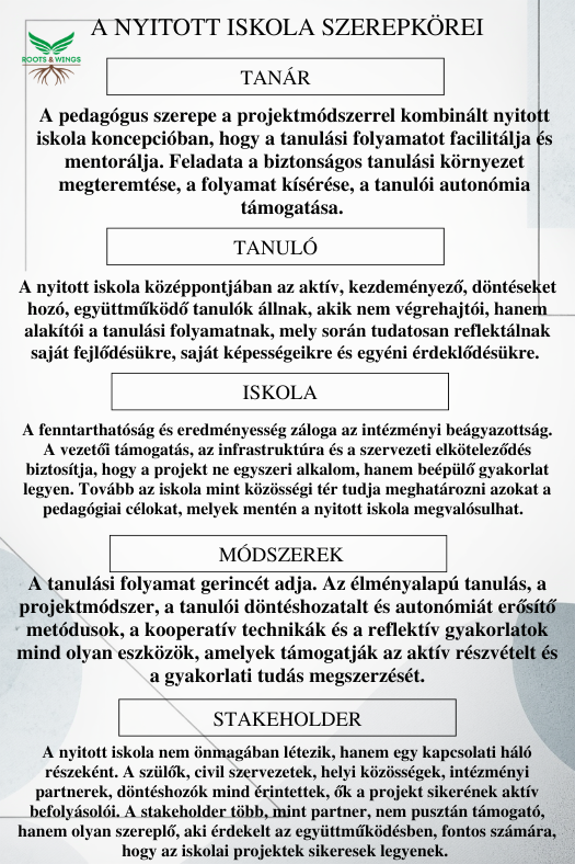 Ezért rajzolódott ki az az ötpilléres (tanár, tanuló, iskola, módszer és stakeholder-ek) gyakorlati keret, amelyhez a jövőben minden, a nyitott iskola koncepciója mentén szervezett projektünket viszonyítani tudjuk. Ebben kiemelkedő szerepe volt annak is, hogy a pedagógusok a találkozót megelőzően már előre elvégezték a partnerek munkatársai által fejlesztett e-learning tananyagot, amely nemcsak a projekt céljait és módszertanát ismertette, hanem előkészítette a gondolkodást és a reflektív szemléletet is. Ez a keret kijelöli a működés fő területeit – de a valódi előrelépést az jelenti, ha ezekhez konkrét szerepeket, felelősségeket és aktivitásokat is társítunk. Ahhoz, hogy a nyitott iskola ne elv maradjon, hanem mindennapi gyakorlat legyen, világosan látnunk kell: kinek mi a feladata, mozgástere és felelőssége ebben a rendszerben.